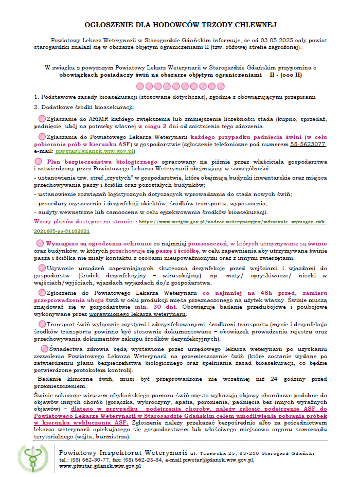 Zgodnie z komunikatem, od dnia 3 maja 2025 r. cały powiat starogardzki znajduje się w obszarze objętym ograniczeniami II (tzw. strefie różowej). Hodowcy są zobowiązani do stosowania zaostrzonych zasad bioasekuracji oraz do przestrzegania procedur określonych przez Inspekcję Weterynaryjną.
