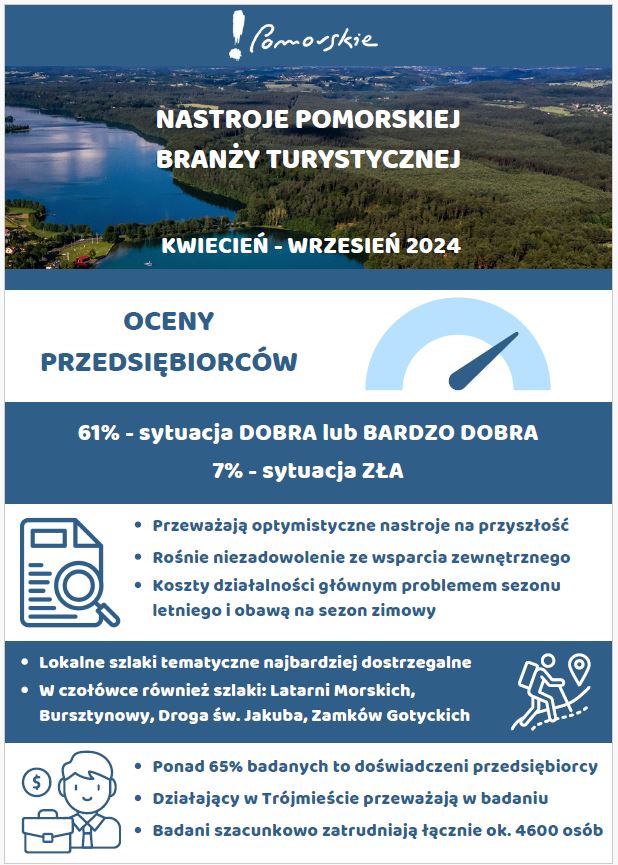 Raport opisuje sytuację bieżącą pomorskich przedsiębiorców branży turystycznej, nastroje na przyszłość, a także oczekiwania przedsiębiorców. W tej edycji badani zostali zapytani też m.in. o szlaki kulturowe oraz regionalny portal turystyczny Pomorskie.travel.